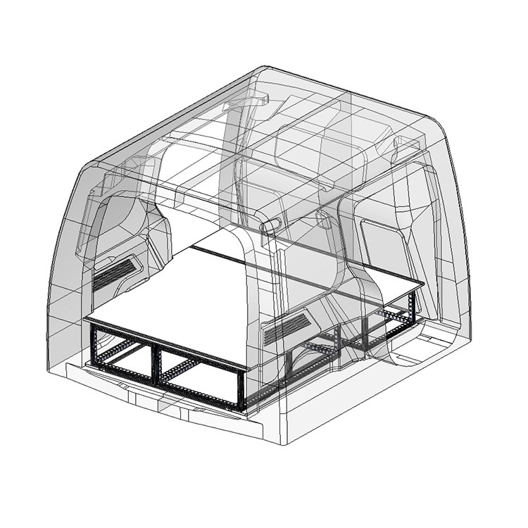 Tuplalattia Citroën Berlingo/Peugeot Partner/Opel Combo L1 2019-. Lattia on suunniteltu sopimaan erikoispitkälle laatikkoratkaisulle, jossa yksi laatikko 486x972x270 ja yksi 648x972x270 tulevat ulos takaovista ja yksi 486x1296x270 laatikosto tulee ulos sivuovesta.