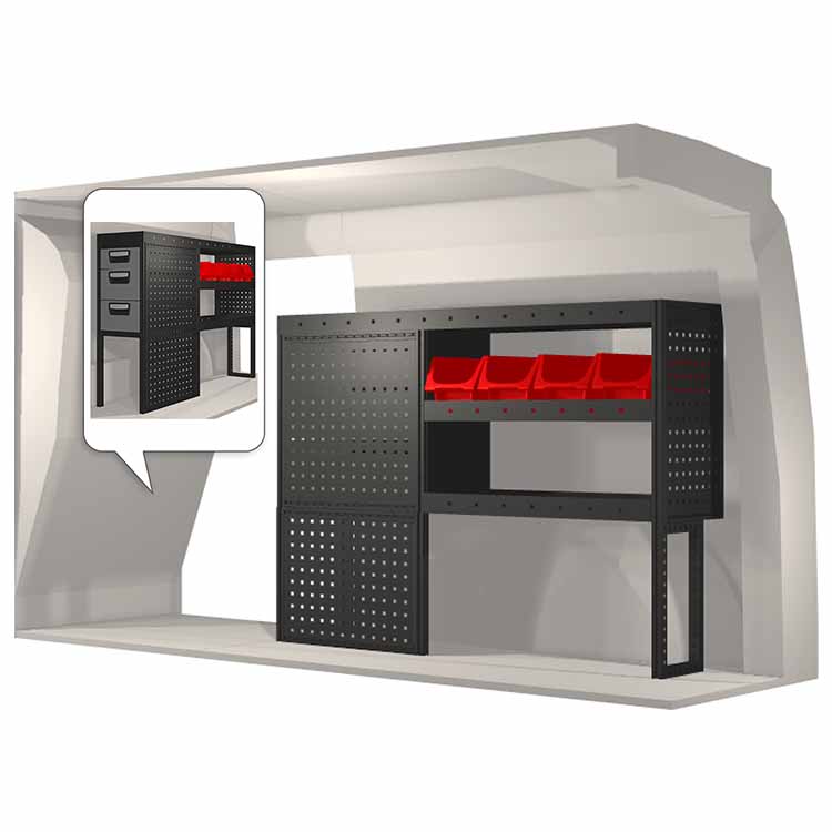 Kaluste-ehdotelmat on suunniteltu sopimaan optimaalisesti ajoneuvoon niin, että kaluste on sekä mahdollisimman toimiva että turvallinen. Kaluste-ehdotelmat on kehitetty ammattikäyttöön täyttämään eri liiketoiminta-alueiden tarpeet huoltotehtävissä. Kaikki hyllyt on varustettu kumimatoilla ja laatikot pitävät sisällään vaahtomuovilevyt. Kaluste-ehdotelmat pitävät sisällään myös kaikki asennustarvikkeet.
