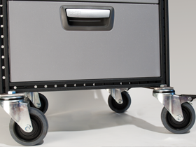 Wheel kit comprising of four wheels, two of which have brakes which allow the kit to be locked into position. The wheels are equipped with specially designed fixing plates for easy mounting onto the T-track.