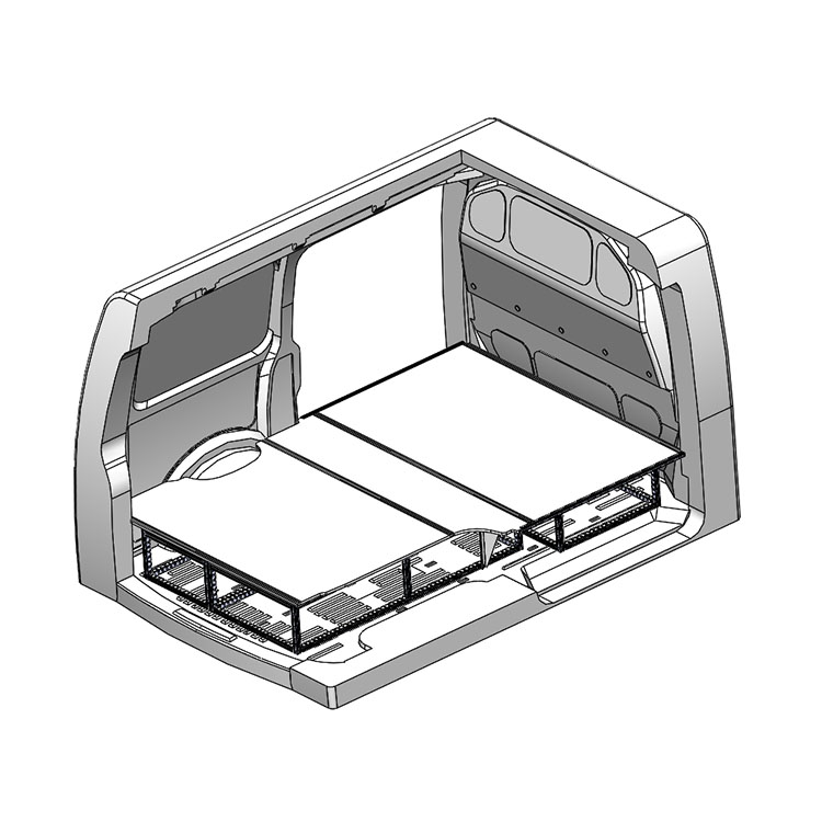 Tuplalattia Volkswagen Transporter 2016- L1 - lämmittimellä. Lattia on suunniteltu sopimaan erikoispitkälle laatikkoratkaisulle, jossa yksi laatikko 486x1458x270 ja yksi 648x1458x270 tulevat ulos takaovista ja yksi 648x1458x270 laatikosto tulee ulos sivuovesta.