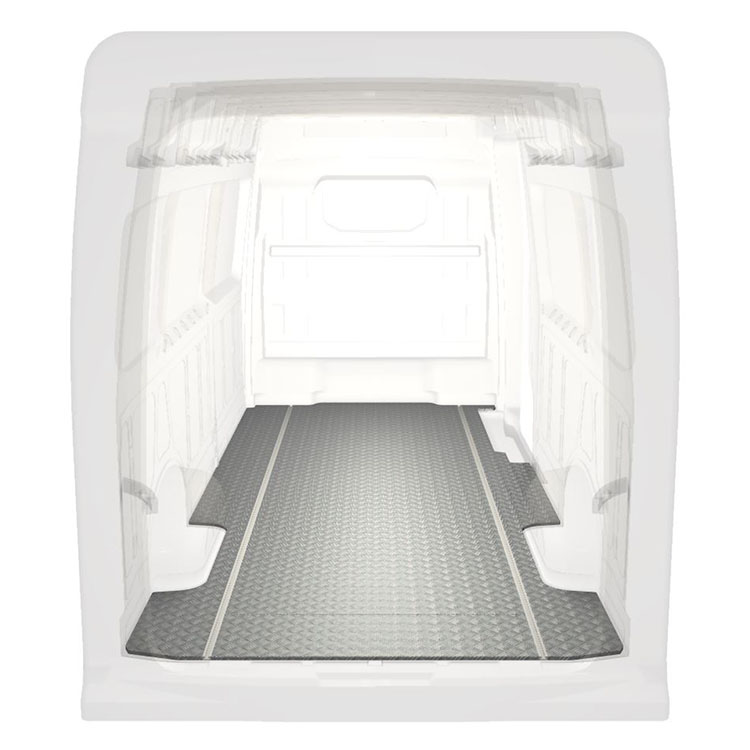 Kevyissä ja kestävissä Volkswagen Crafter / MAN TGE tarkoitetuissa vakiolattioissa on luistamaton alumiinikulutuspinta ja kuormakiskot (pitkittäiset) kalusteiden ja muiden lisävarusteiden turvallista ja nopeaa asennusta varten.