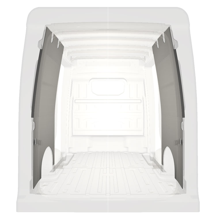 Kevyt sisäseinien kokopaneeliverhous Volkswagen Crafter / MAN TGE , jossa on kaksoissivuovet. Verhouspaneelimme luovat valoisan ja miellyttävän työympäristön, ja ne on helppo pyyhkiä puhtaaksi.