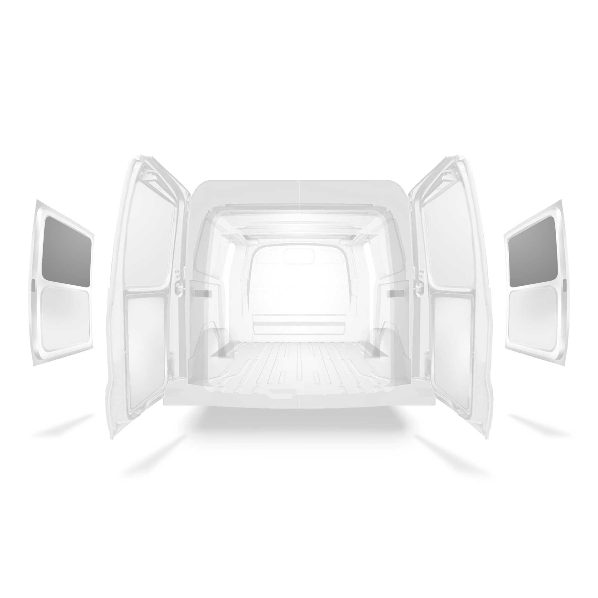 Kevyt sivuoven yläosan verhous Ford Transit Custom, jossa on kaksoissivuovet. Verhous vähentää sisätilojen kulumista, ja auttaa säilyttämään auton jäännösarvon.