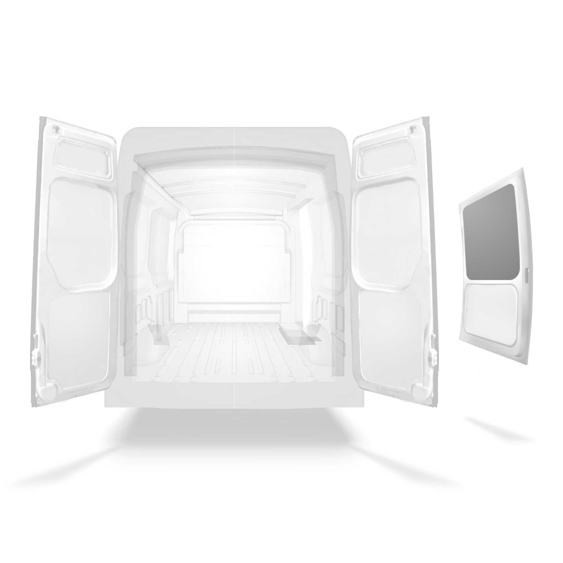 Kevyt sivuoven yläosan verhous Ford Transit, jossa on sivuovi oikealla. Verhous vähentää sisätilojen kulumista, ja auttaa säilyttämään auton jäännösarvon.