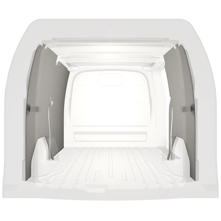 Kevyt sisäseinien kokopaneeliverhous Ford Transit Custom, jossa on sivuovi oikealla. Verhouspaneelimme luovat valoisan ja miellyttävän työympäristön, ja ne on helppo pyyhkiä puhtaaksi.