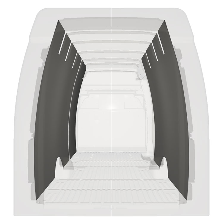 Kevyt sisäseinien kokopaneeliverhous Iveco Daily, jossa on sivuovi oikealla. Verhouspaneelimme luovat valoisan ja miellyttävän työympäristön, ja ne on helppo pyyhkiä puhtaaksi.