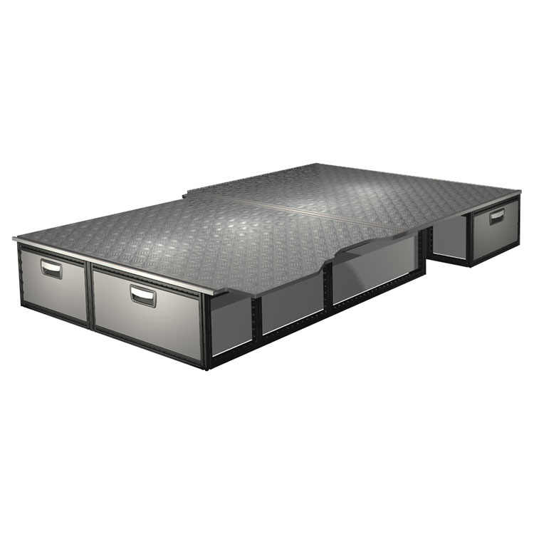 The kit is designed to be fitted on top of a wooden floor. The double floor is equipped with rails for easy installation of vehicle racking, and edging strips for a nice finish.