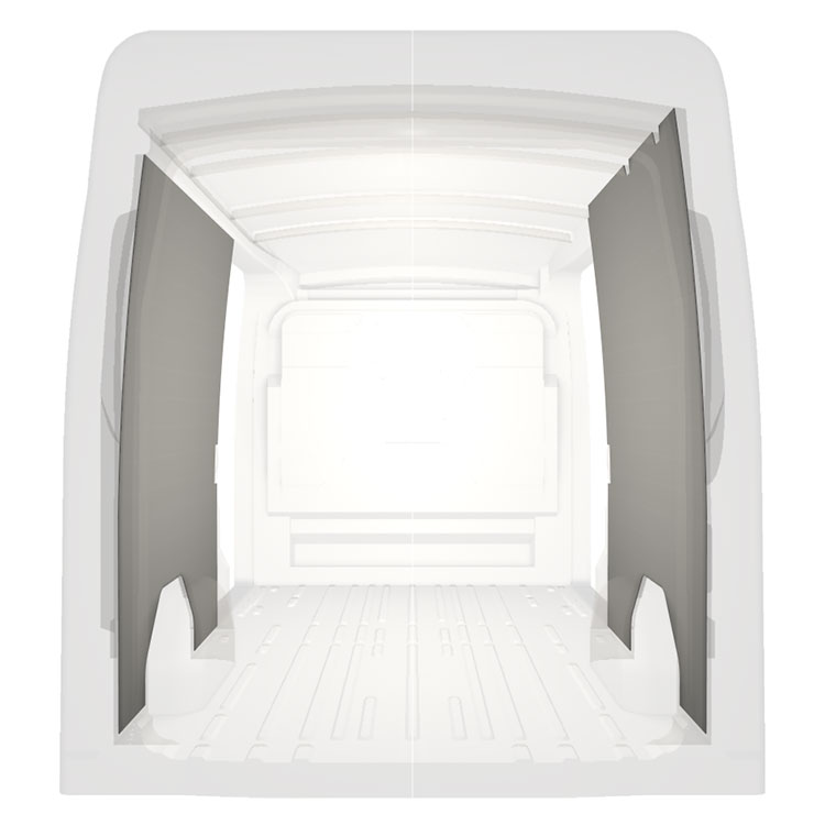 Kevyt sisäseinien kokopaneeliverhous Ford Transit, jossa on kaksoissivuovet. Verhouspaneelimme luovat valoisan ja miellyttävän työympäristön, ja ne on helppo pyyhkiä puhtaaksi.