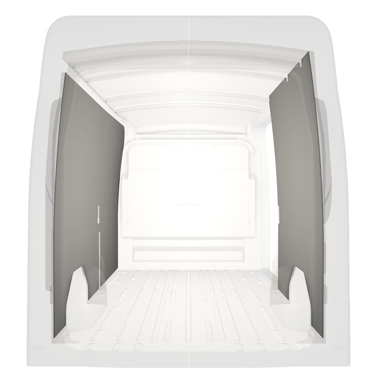 Kevyt sisäseinien kokopaneeliverhous Ford Transit, jossa on sivuovi oikealla. Verhouspaneelimme luovat valoisan ja miellyttävän työympäristön, ja ne on helppo pyyhkiä puhtaaksi.