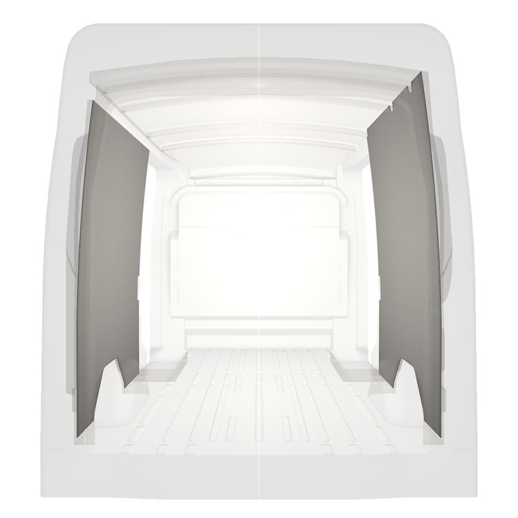 Kevyt sisäseinien kokopaneeliverhous Ford Transit, jossa on kaksoissivuovet. Verhouspaneelimme luovat valoisan ja miellyttävän työympäristön, ja ne on helppo pyyhkiä puhtaaksi.