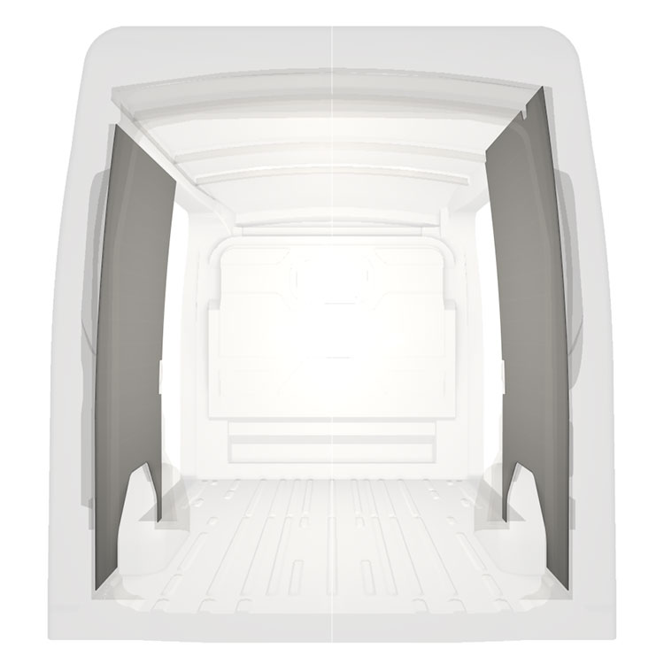 Kevyt sisäseinien kokopaneeliverhous Ford Transit, jossa on kaksoissivuovet. Verhouspaneelimme luovat valoisan ja miellyttävän työympäristön, ja ne on helppo pyyhkiä puhtaaksi.