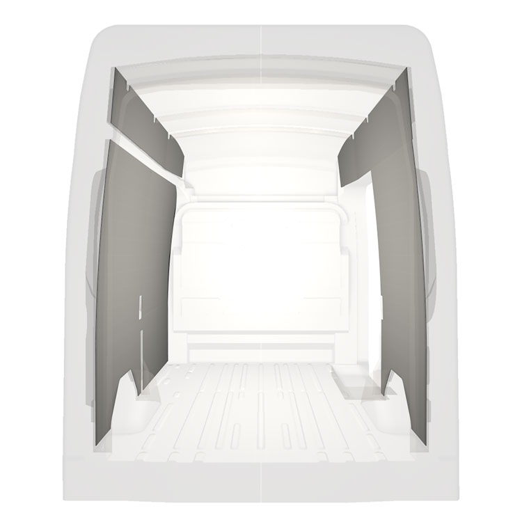 Kevyt sisäseinien kokopaneeliverhous Ford Transit, jossa on sivuovi oikealla. Verhouspaneelimme luovat valoisan ja miellyttävän työympäristön, ja ne on helppo pyyhkiä puhtaaksi.