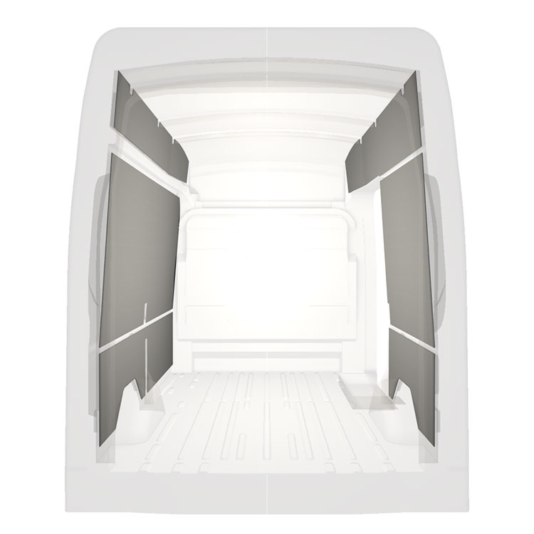 Kevyt sisäseinien paneeliverhous Ford Transit, jossa on sivuovi oikealla. Verhouspaneelimme luovat valoisan ja miellyttävän työympäristön, ja ne on helppo pyyhkiä puhtaaksi.