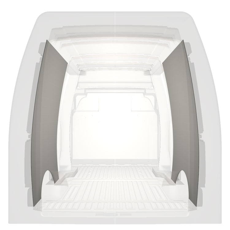 Kevyt sisäseinien kokopaneeliverhous Iveco Daily, jossa on kaksoissivuovet. Verhouspaneelimme luovat valoisan ja miellyttävän työympäristön, ja ne on helppo pyyhkiä puhtaaksi.