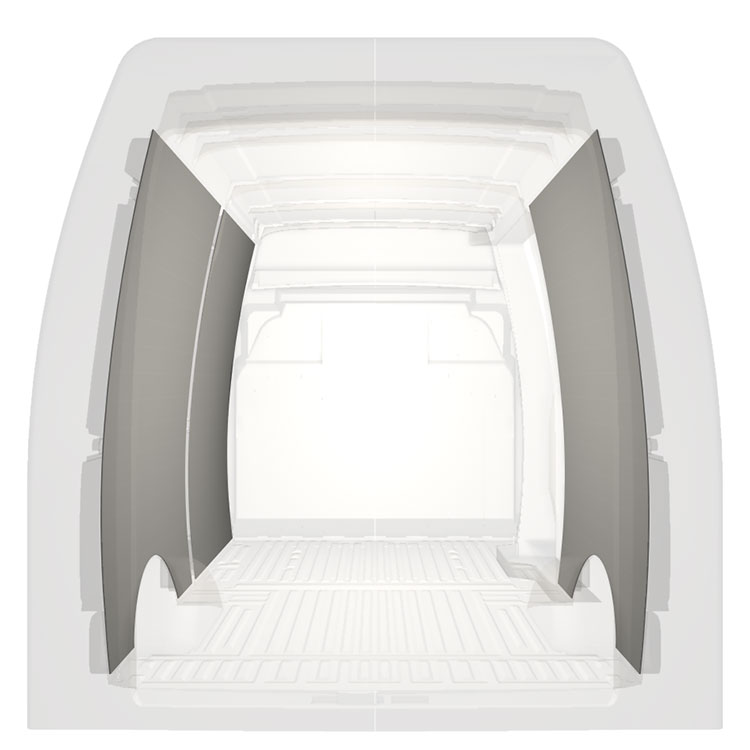 Kevyt sisäseinien kokopaneeliverhous Iveco Daily, jossa on sivuovi oikealla. Verhouspaneelimme luovat valoisan ja miellyttävän työympäristön, ja ne on helppo pyyhkiä puhtaaksi.
