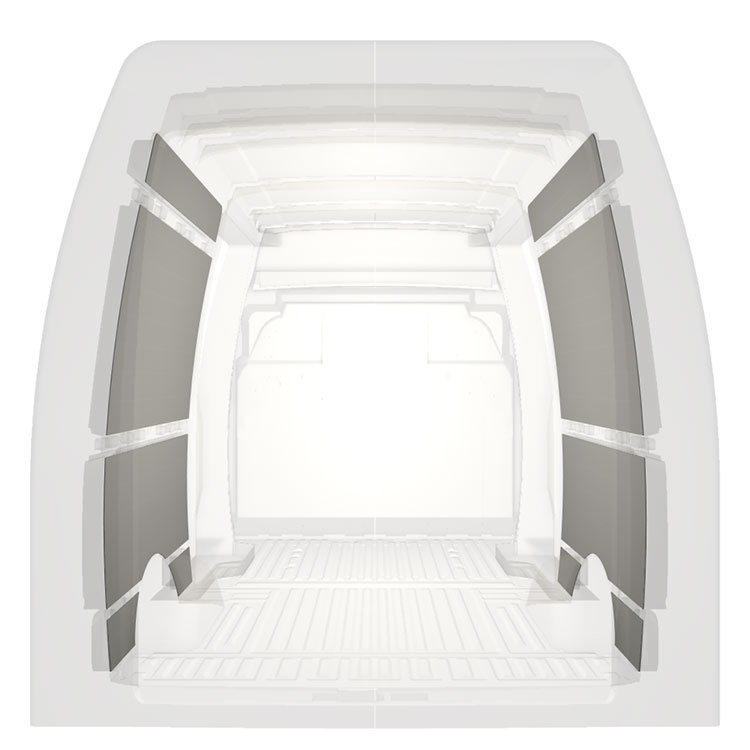 Kevyt valmiiksi leikattu sisäseinien paneeliverhous Iveco Daily, jossa on kaksoissivuovet. Verhouspaneelimme luovat valoisan ja miellyttävän työympäristön, ja ne on helppo pyyhkiä puhtaaksi.