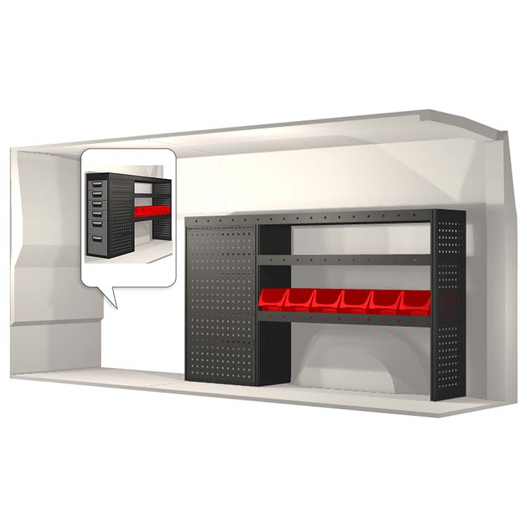 Kaluste-ehdotelmat on suunniteltu sopimaan optimaalisesti ajoneuvoon niin, että kaluste on sekä mahdollisimman toimiva että turvallinen. Kaluste-ehdotelmat on kehitetty ammattikäyttöön täyttämään eri liiketoiminta-alueiden tarpeet huoltotehtävissä. Kaikki hyllyt on varustettu kumimatoilla ja laatikot pitävät sisällään vaahtomuovilevyt. Kaluste-ehdotelmat pitävät sisällään myös kaikki asennustarvikkeet.