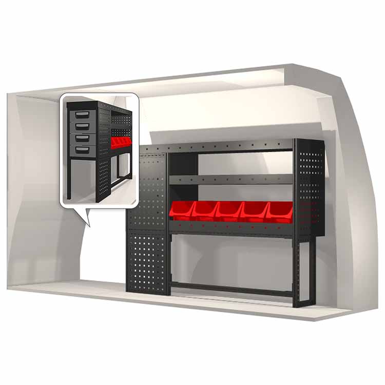 Kaluste-ehdotelmat on suunniteltu sopimaan optimaalisesti ajoneuvoon niin, että kaluste on sekä mahdollisimman toimiva että turvallinen. Kaluste-ehdotelmat on kehitetty ammattikäyttöön täyttämään eri liiketoiminta-alueiden tarpeet huoltotehtävissä. Kaikki hyllyt on varustettu kumimatoilla ja laatikot pitävät sisällään vaahtomuovilevyt. Kaluste-ehdotelmat pitävät sisällään myös kaikki asennustarvikkeet.