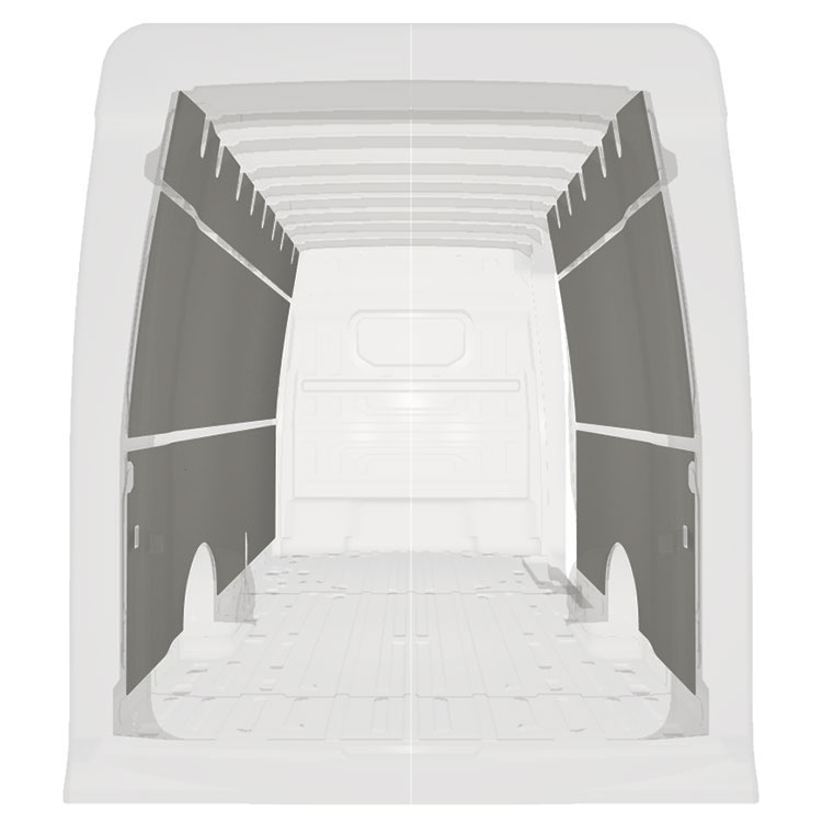 Kevyt sisäseinien paneeliverhous Volkswagen Crafter / MAN TGE , jossa on sivuovi oikealla. Verhouspaneelimme luovat valoisan ja miellyttävän työympäristön, ja ne on helppo pyyhkiä puhtaaksi.