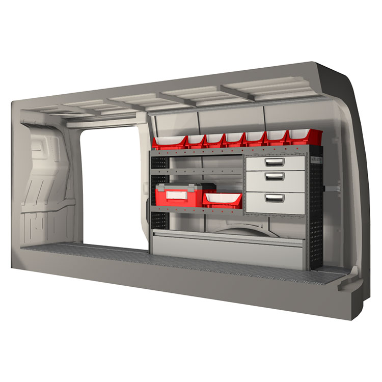 The racking has been specially designed to ensure the optimum fit to the vehicle, as well as the best possible functionality and safety. It has been developed for professional use, is flexible and is intended for service jobs in various types of business. All shelves are equipped with rubber mats, and all drawers with foam plastic liners. Assembly material is included.
