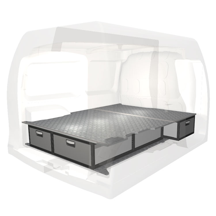 The kit is designed to be fitted on top of a Modul-Floor, utilizing the floor rails for a non-intrusive installation. The double floor is equipped with rails for easy installation of vehicle racking, and edging strips for a nice finish.