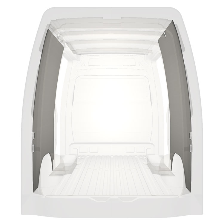 Kevyt sisäseinien kokopaneeliverhous Mercedes Sprinter, jossa on kaksoissivuovet. Verhouspaneelimme luovat valoisan ja miellyttävän työympäristön, ja ne on helppo pyyhkiä puhtaaksi.