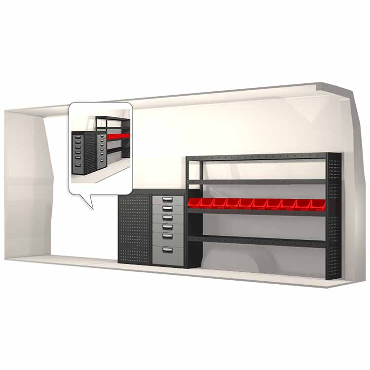 Kaluste-ehdotelmat on suunniteltu sopimaan optimaalisesti ajoneuvoon niin, että kaluste on sekä mahdollisimman toimiva että turvallinen. Kaluste-ehdotelmat on kehitetty ammattikäyttöön täyttämään eri liiketoiminta-alueiden tarpeet huoltotehtävissä. Kaikki hyllyt on varustettu kumimatoilla ja laatikot pitävät sisällään vaahtomuovilevyt. Kaluste-ehdotelmat pitävät sisällään myös kaikki asennustarvikkeet.