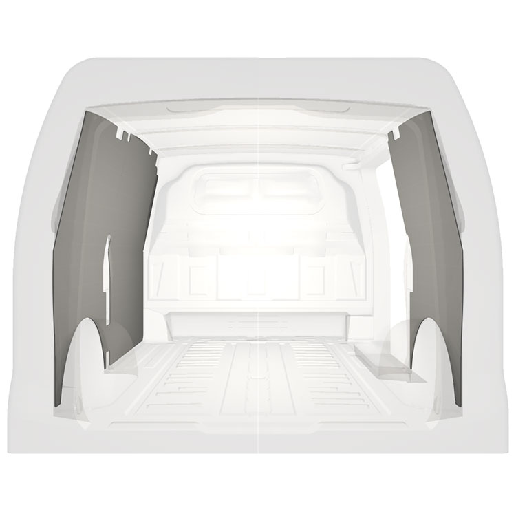 Kevyt sisäseinien kokopaneeliverhous Mercedes Vito, jossa on sivuovi oikealla. Verhouspaneelimme luovat valoisan ja miellyttävän työympäristön, ja ne on helppo pyyhkiä puhtaaksi.