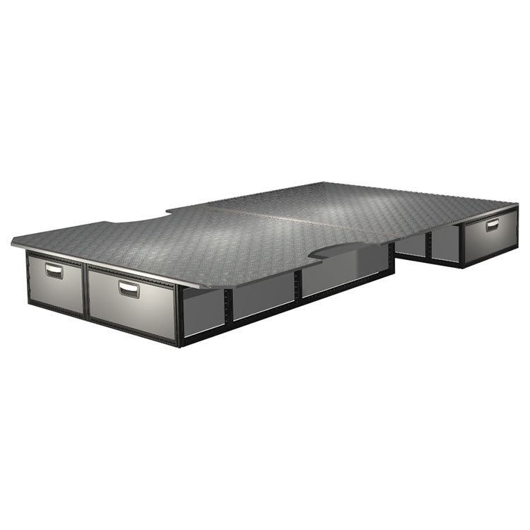 The kit is designed to be fitted on top of a Modul-Floor, utilizing the floor rails for a non-intrusive installation. The double floor is equipped with rails for easy installation of vehicle racking, and edging strips for a nice finish.