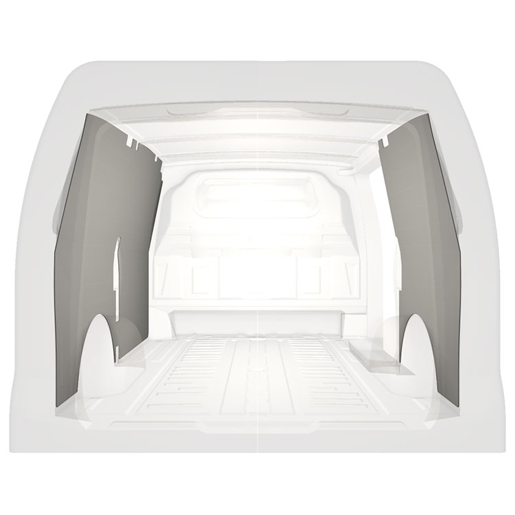 Kevyt sisäseinien kokopaneeliverhous Mercedes Vito, jossa on sivuovi oikealla. Verhouspaneelimme luovat valoisan ja miellyttävän työympäristön, ja ne on helppo pyyhkiä puhtaaksi.