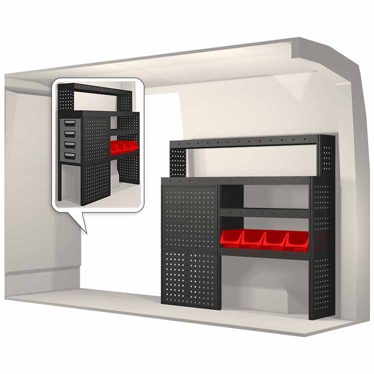 Kaluste-ehdotelmat on suunniteltu sopimaan optimaalisesti ajoneuvoon niin, että kaluste on sekä mahdollisimman toimiva että turvallinen. Kaluste-ehdotelmat on kehitetty ammattikäyttöön täyttämään eri liiketoiminta-alueiden tarpeet huoltotehtävissä. Kaikki hyllyt on varustettu kumimatoilla ja laatikot pitävät sisällään vaahtomuovilevyt. Kaluste-ehdotelmat pitävät sisällään myös kaikki asennustarvikkeet.