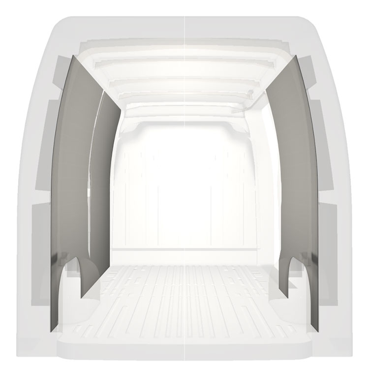 Kevyt sisäseinien kokopaneeliverhous Renault Master / Opel Movano / Nissan NV400, jossa on sivuovi oikealla. Verhouspaneelimme luovat valoisan ja miellyttävän työympäristön, ja ne on helppo pyyhkiä puhtaaksi.