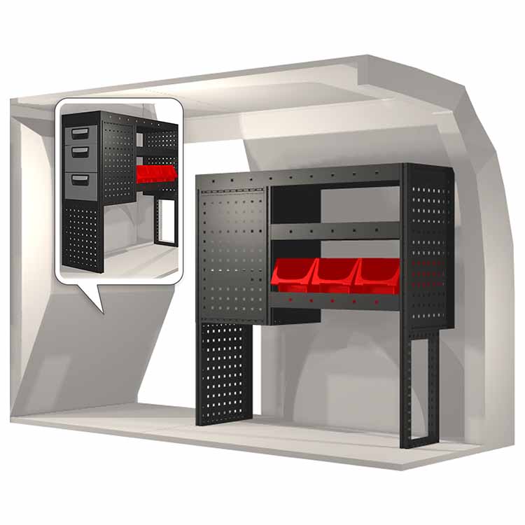 Kaluste-ehdotelmat on suunniteltu sopimaan optimaalisesti ajoneuvoon niin, että kaluste on sekä mahdollisimman toimiva että turvallinen. Kaluste-ehdotelmat on kehitetty ammattikäyttöön täyttämään eri liiketoiminta-alueiden tarpeet huoltotehtävissä. Kaikki hyllyt on varustettu kumimatoilla ja laatikot pitävät sisällään vaahtomuovilevyt. Kaluste-ehdotelmat pitävät sisällään myös kaikki asennustarvikkeet.