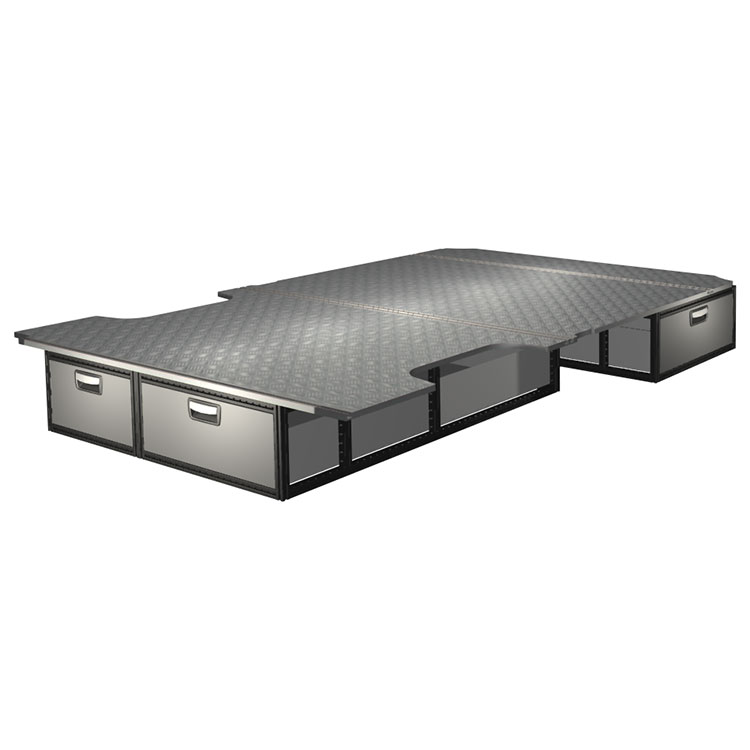 The kit is designed to be fitted on top of a Modul-Floor, utilizing the floor rails for a non-intrusive installation. The double floor is equipped with rails for easy installation of vehicle racking, and edging strips for a nice finish.