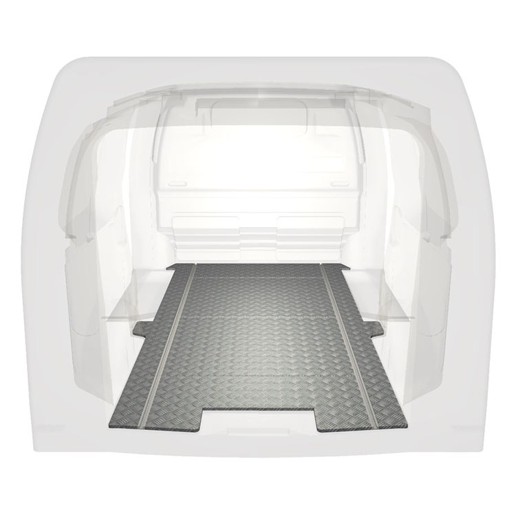 Kevyissä ja kestävissä Citroën Jumpy / Peugeot Expert / Toyota ProAce tarkoitetuissa vakiolattioissa on luistamaton alumiinikulutuspinta ja kuormakiskot (pitkittäiset) kalusteiden ja muiden lisävarusteiden turvallista ja nopeaa asennusta varten.