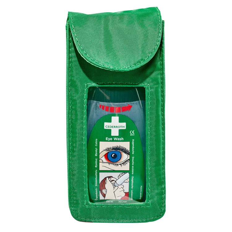 Nylonista valmistettu vyökotelo. Taskukokoinen Cederroth silmänhuuhtelupullo voidaan pitään aina kätevästi mukana.
