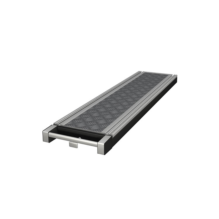 Lightweight and robust base frame made from ultra-high strength steel, with a front in anodized aluminum and a loading platform in lightweight sandwich material with an aluminum top.