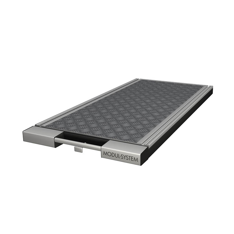 Lightweight and robust base frame made from ultra-high strength steel, with a front in anodized aluminum and a loading platform in lightweight sandwich material with an aluminum top.