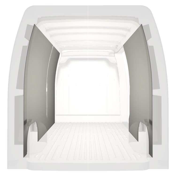 Kevyt sisäseinien kokopaneeliverhous Renault Master / Opel Movano / Nissan NV400, jossa on sivuovi oikealla. Verhouspaneelimme luovat valoisan ja miellyttävän työympäristön, ja ne on helppo pyyhkiä puhtaaksi.