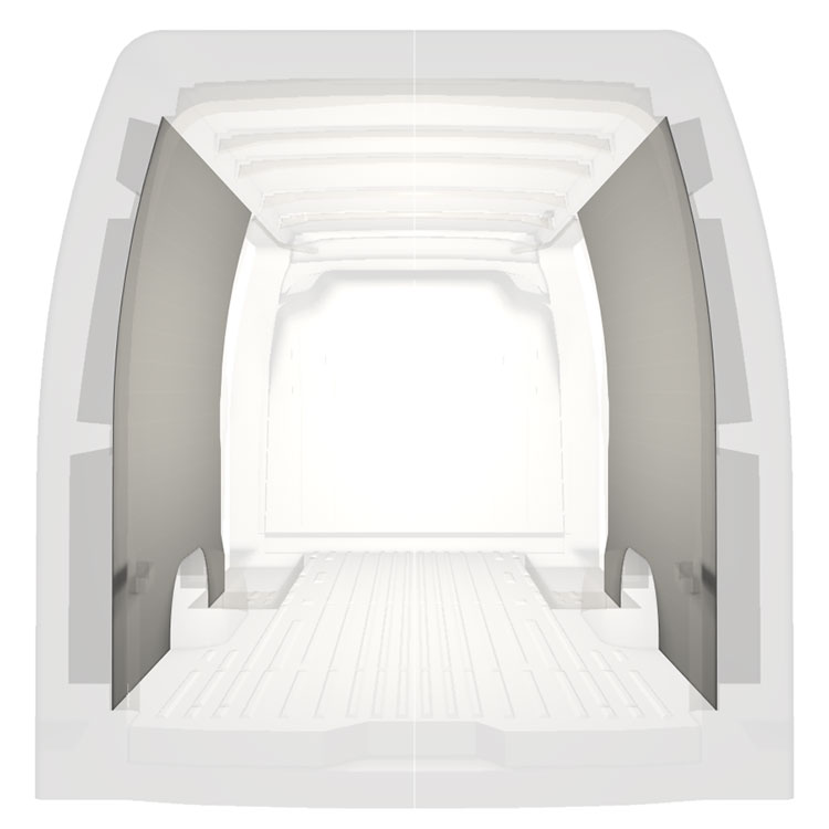 Kevyt sisäseinien kokopaneeliverhous Renault Master / Opel Movano / Nissan NV400, jossa on kaksoissivuovet. Verhouspaneelimme luovat valoisan ja miellyttävän työympäristön, ja ne on helppo pyyhkiä puhtaaksi.