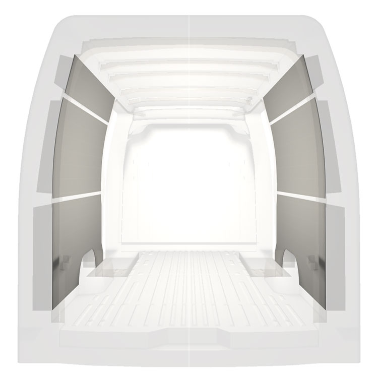 Kevyt valmiiksi leikattu sisäseinien paneeliverhous Renault Master / Opel Movano / Nissan NV400, jossa on kaksoissivuovet. Verhouspaneelimme luovat valoisan ja miellyttävän työympäristön, ja ne on helppo pyyhkiä puhtaaksi.