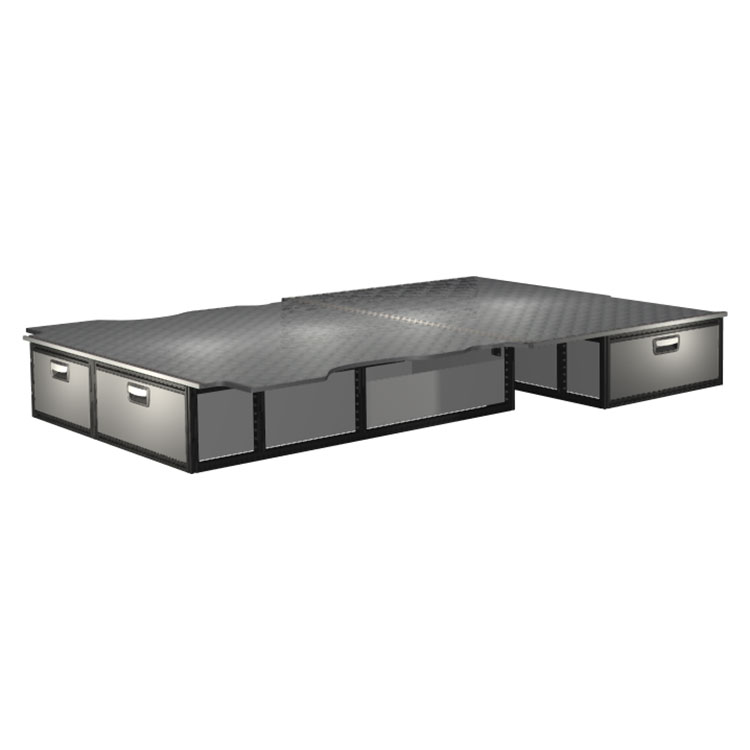 The kit is designed to be fitted on top of a wooden floor. The double floor is equipped with rails for easy installation of vehicle racking, and edging strips for a nice finish.