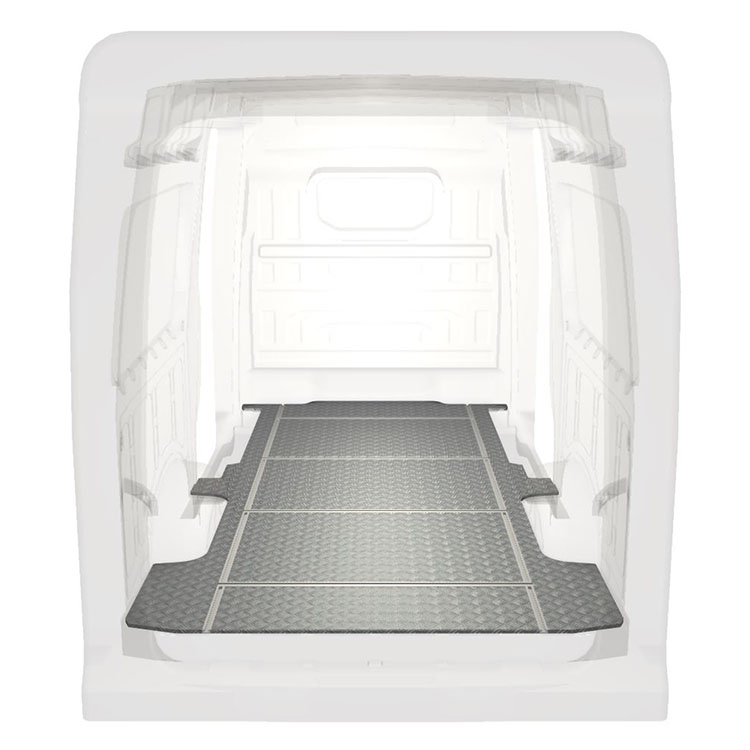 Kevyissä ja kestävissä Volkswagen Crafter / MAN TGE tarkoitetuissa lattioissa on luistamaton alumiinikulutuspinta ja kuormakiskot (pitkittäiset ja poikittaiset) kalusteiden ja muiden lisävarusteiden turvallista ja nopeaa asennusta varten.