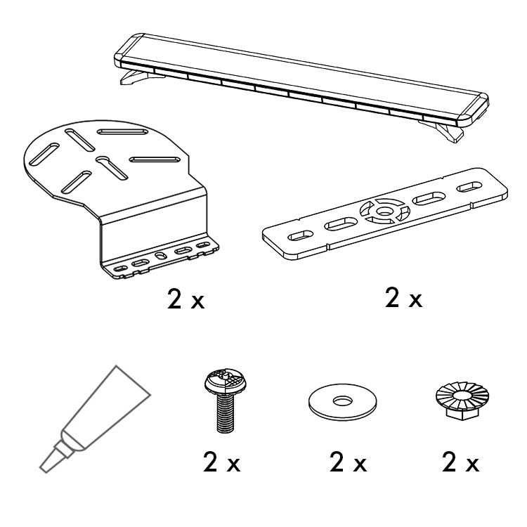 Sarja sisältää valotelineen ja täydellisen kiinnikesarjan, jolla telineen voi kiinnittää ajoneuvon alkuperäisiin kiinnityspisteisiin. Integroitujen kiinnityspisteiden ansiosta ajoneuvon runkoon ei tarvitse porata turhia reikiä, mikä eliminoi korroosionriskin ja suojaa ajoneuvon jäännösarvoa.