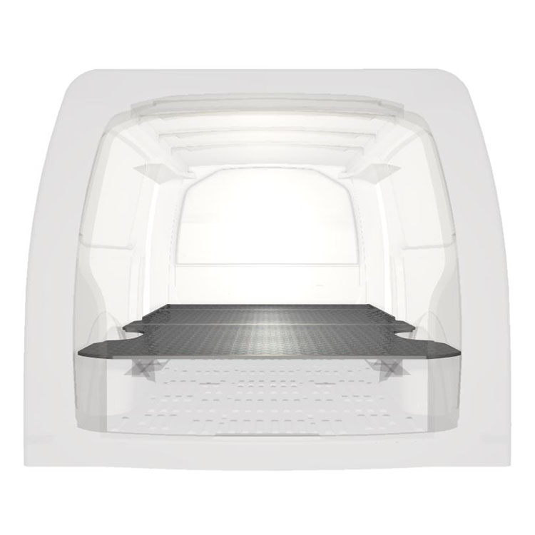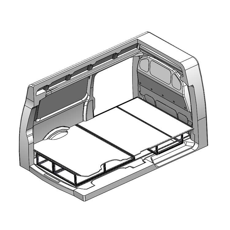 Tuplalattia Volkswagen Transporter 2016- L2 - ilman lämmitintä. Lattia on suunniteltu sopimaan erikoispitkälle laatikkoratkaisulle, jossa yksi laatikko 486x1458x270 ja yksi 648x1458x270 tulevat ulos takaovista ja yksi 648x1458x270 laatikosto tulee ulos sivuovesta.