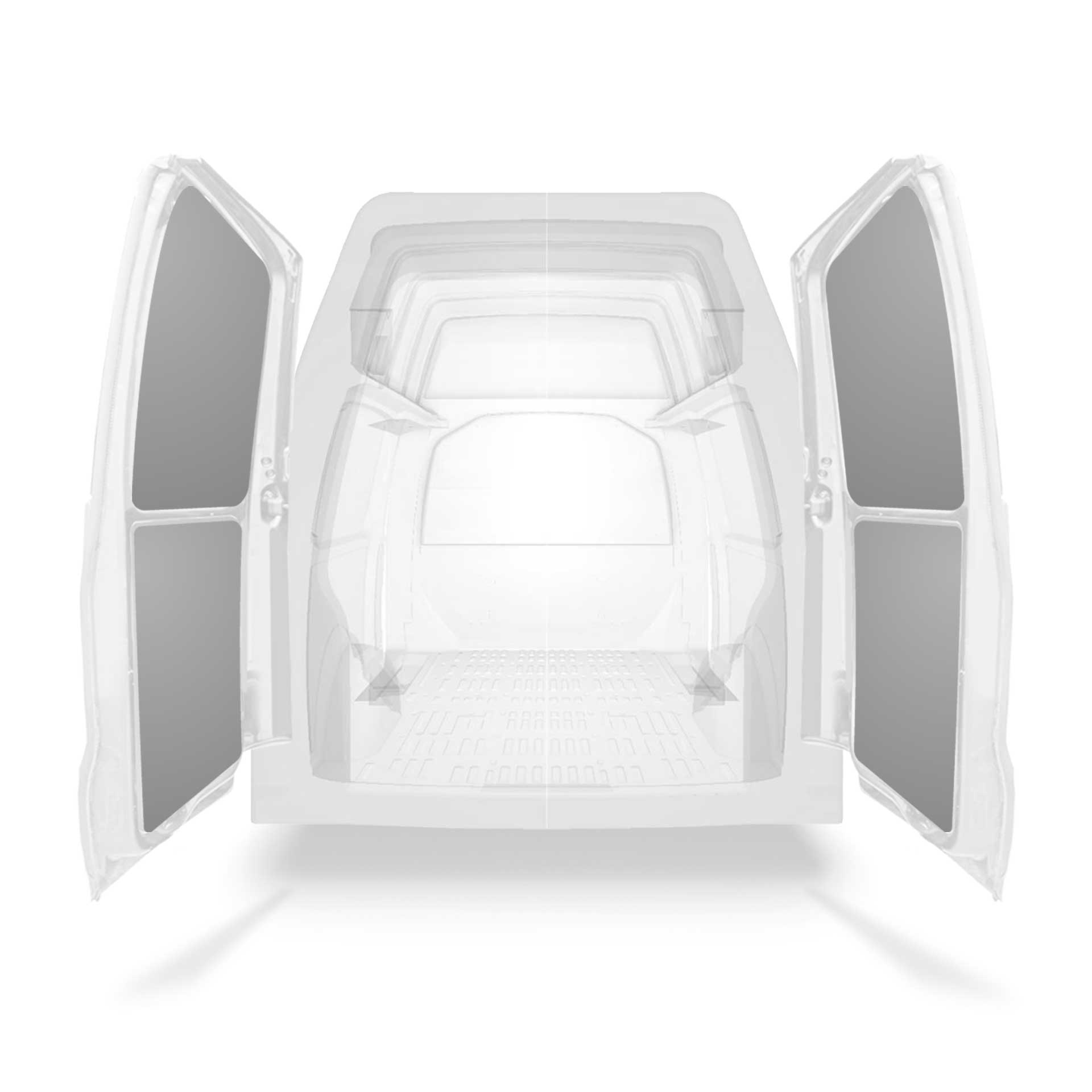Kevyt takaoven paneeliverhous Volkswagen Transporter T6:n, jossa on kaksoisovet. Oviverhoukset on suunniteltu antamaan sisäpuolelle ammattimainen ilme, ne suojaavat autoa ja on helppo pyyhkiä puhtaaksi.